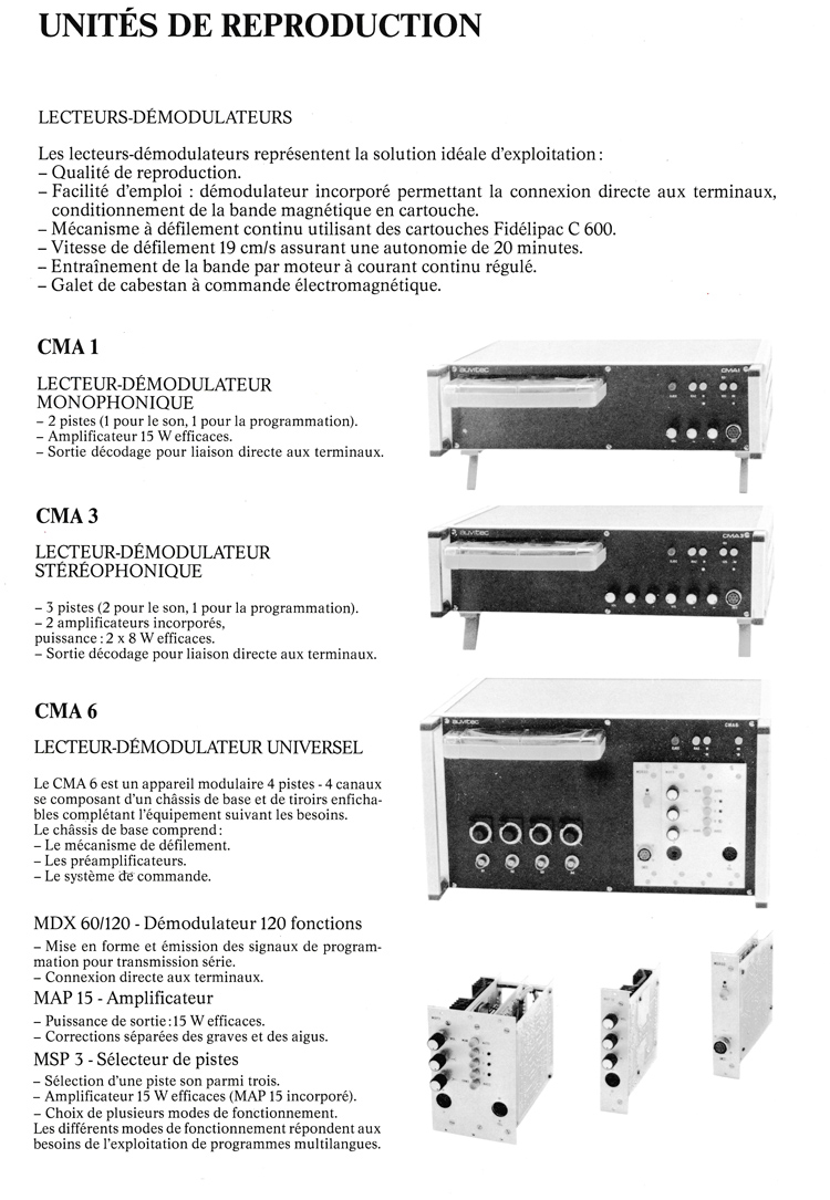 La gamme des lecteur CMA est plus compacte et abandonne le coffret CAMAC. La platine mécanique fait appel à un moteur ESCAP à rotor sans fer et régulation électronique. Le couple développé était largement suffisant pour entrainer une FIDELIPAC C 600 à 9,5, 19 voire 38 cm/s.