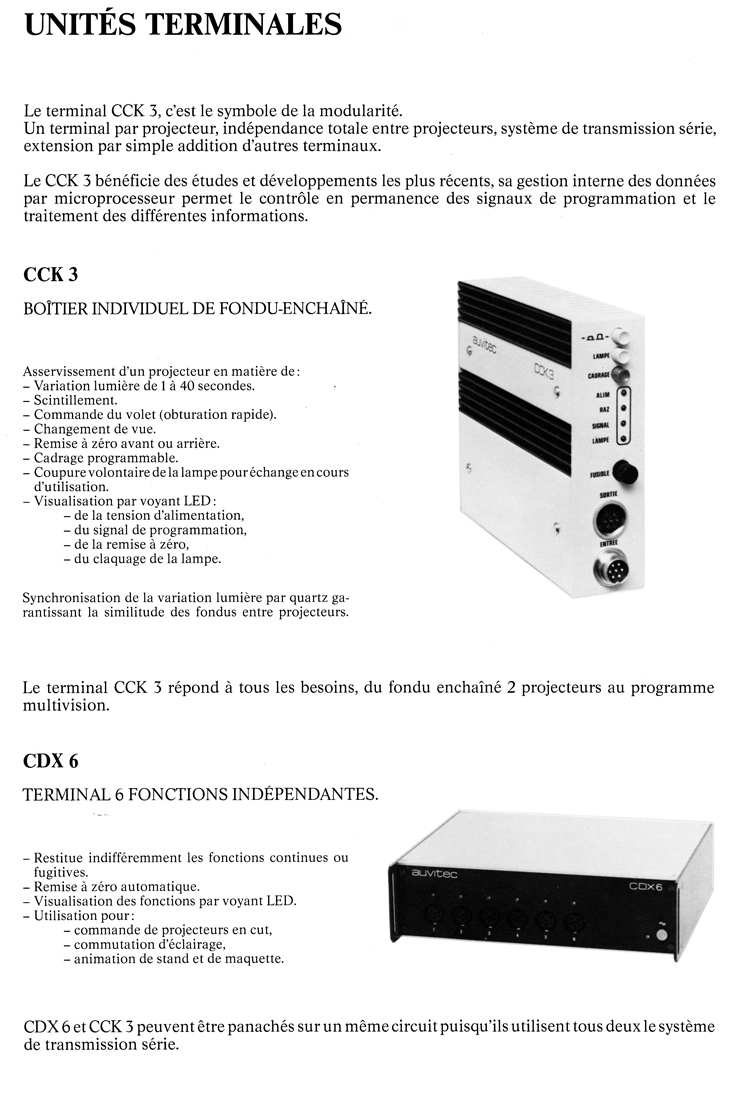 Dès l'origine en 1972 AUVITEC a dévelppé ses propres outils de programmation et de reproduction.Au départ, ces outils n'étaient pas destinés à être mis sur le marché. AUVITEC fournissait une prestation complète avec encodage de la programmation et diffusion sur le site désigné par le client. L'installation et la mise en place des équipements de reproduction faisant partie de la prestation globale.