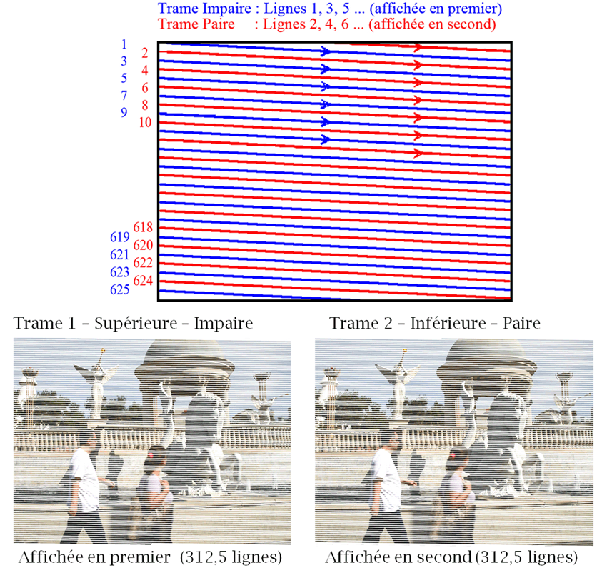 En mode vidéo entrelacé, l’image est constituée de 2 demies images que l’on appelle trames. Pour recomposer proprement l’image, il faut afficher les trames dans le bon ordre puisqu’il s’agit d’un affichage séquentiel qui se déroule dans le temps. Il faut donc afficher la première trame en premier, ça semble être une lapalissade mais c’est de première importance. Il y a une trame Impaire qui démarre en début de ligne et couvre toutes les lignes impaires 1, 3, 5, etc. Cette trame est affichée en premier, c’est la première trame.
