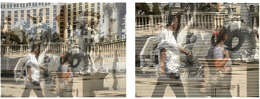 Si l’on affiche les 2 trames en même temps sans respecter le décalage temporel, on obtient une image dégradée qui combine les 2 trames en une seule unité de temps.