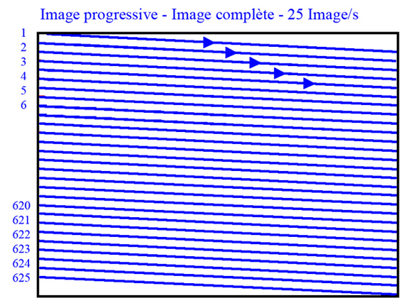 En progressif, il n’y a qu’une seule image complète à la cadence de 25 images par seconde (en Europe). Contrairement au mode entrelacé, en progressif, on dispose d’un cliché unique et complet tous les 25 eme de seconde au lieu de deux demis clichés séparés dans le temps par un intervalle d’un 50ème de seconde.
