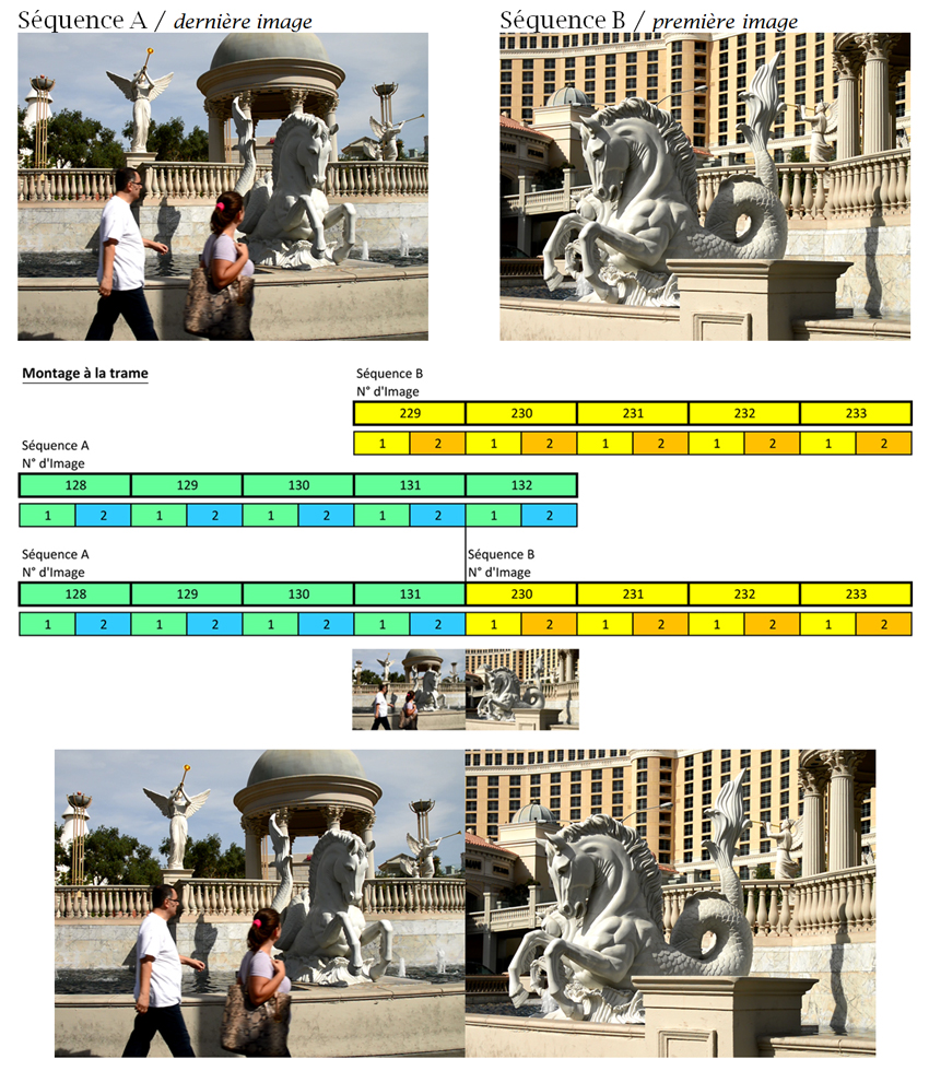Lorsqu’on réalise un point de montage, on raccorde une image A avec une image B. En mode entrelacé, il est impératif de raccorder 2 images entières. Ce qui veut dire que l’on va raccorder les 2 trames A1 + A2 de l’Image A aux trames B1 + B2 de l’image B.