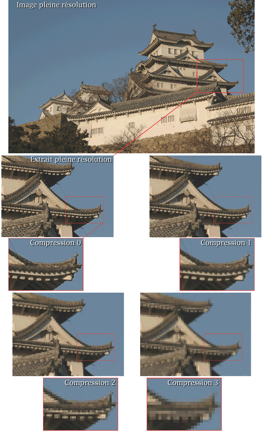 On peut comparer l’image de base, en pleine résolution, aux images détériorées qui ont subi une compression.