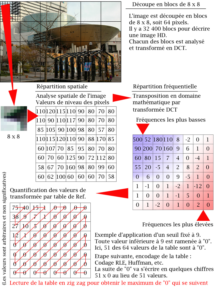 On transforme les pixels en valeur de coefficients liés à la fréquence d’analyse de la zone. Le coefficient le plus élevé correspond à la zone où les pixels changent le plus rapidement d’état (luminance et chrominance) alors que les coefficients les plus faibles sont le reflet des zones qui changent le moins fréquemment.