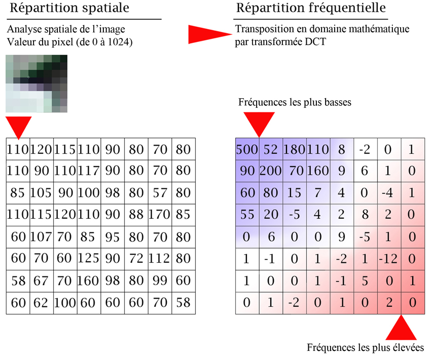 En revanche, avec la transformée en DCT, on décrit la totalité des informations de l'image par un ensemble de coefficients, relatifs aux fréquences, dans un domaine mathématique.