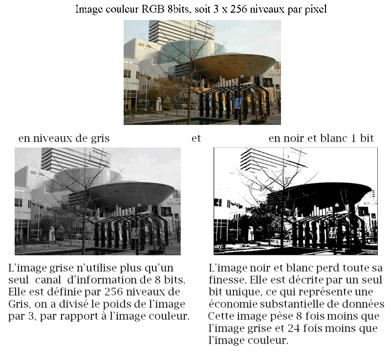 Quand on étudie une image, on a affaire a une fonction spatiale à 3 facteurs : X et Y, qui localisent le pixel dans l’image, et le facteur Z qui fournit la valeur du pixel. En RGB, on multiplie par 3 les informations, puisque chacune des composantes de couleur donne une valeur à chaque pixel.